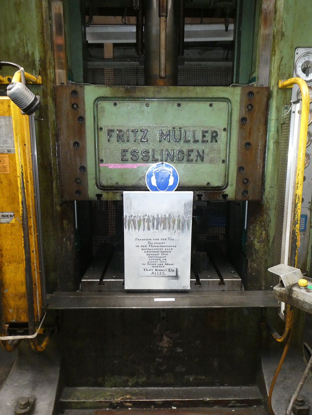 So wurde nun ein Modell im Noppenblech-Design feierlich enthüllt. Dies unternahmen der Hammer Oberbürgermeister Thomas Hunsteger-Petermann und Jürgen Henke, Geschäftsführer der Metallwerke Renner aus Ahlen. Dieses Modell zur Pfosten- und Wandbefestigung sollte bewusst auffällig sein. Daher wurde es vom Hersteller Metallwerke Renner in pinker Farbe gepulvert – passend zu der Kampagne „Hier pulsiert die Kunst“.